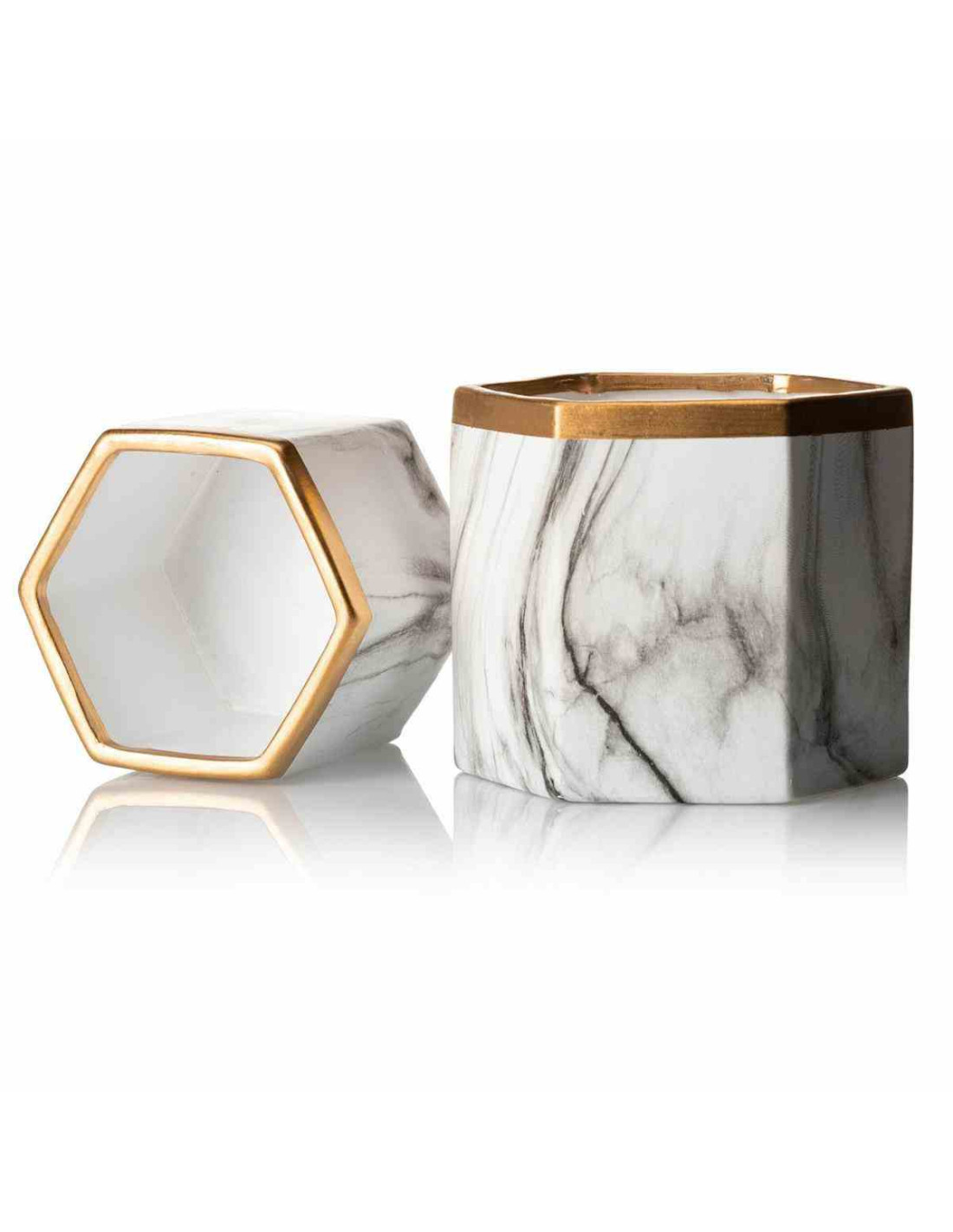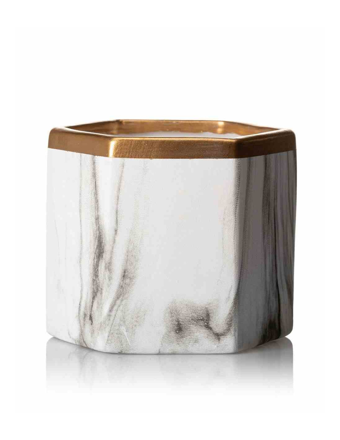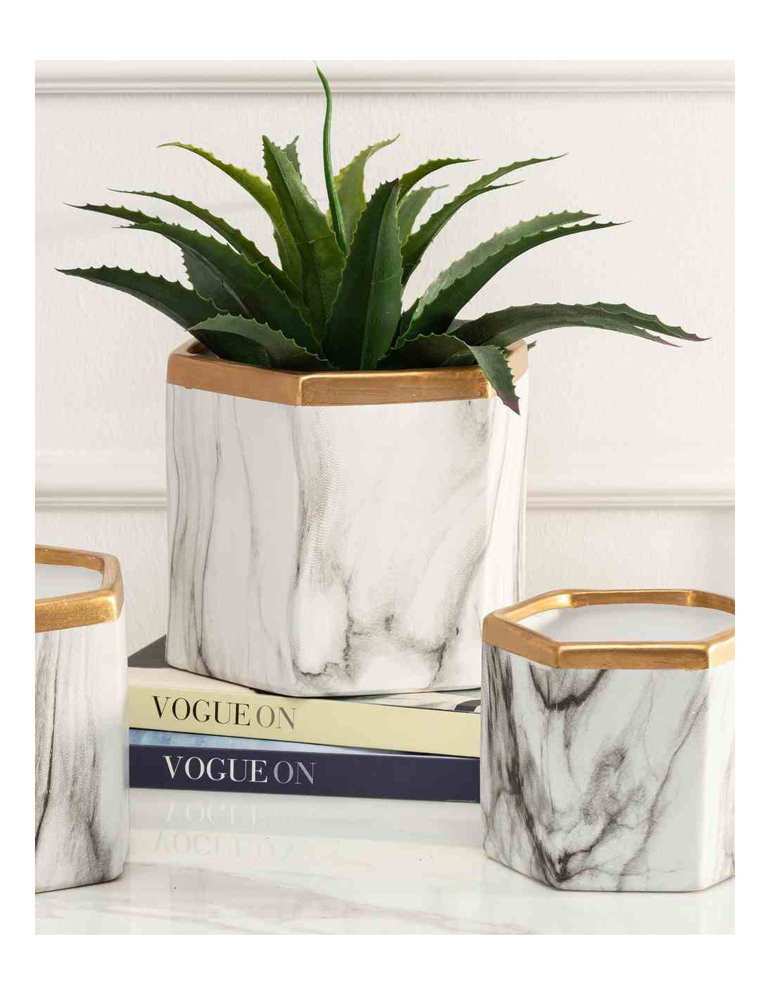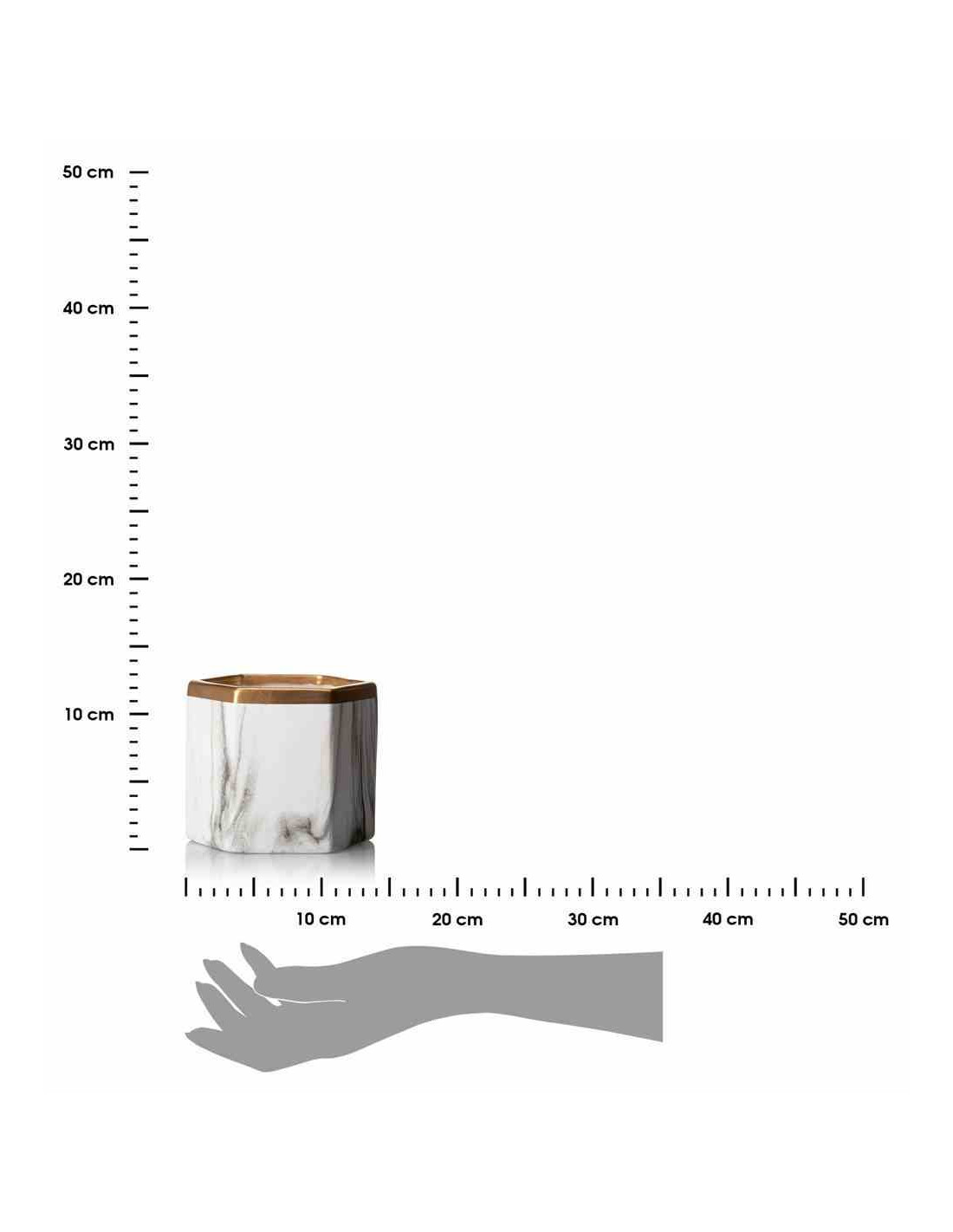 Doniczka Sona Marbling 12 cm Wykonana z ceramiki w kolorze białego marmuru ze złotym wykończeniem o średnicy 14 cm
