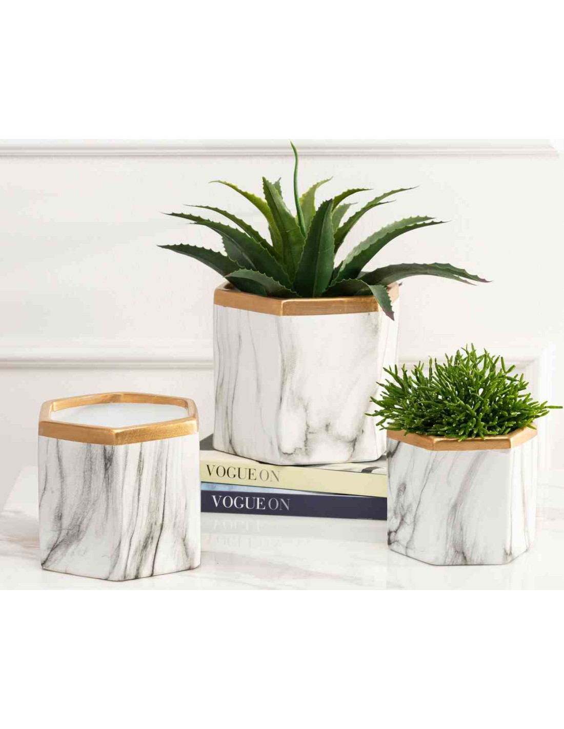 HowHomelyUwielbiasz gustowne dodatki tak samo mocno jak rośliny doniczkowe? Nowoczesna doniczka w kolorze białego marmuru ze złotym, ręcznie malowanym wykończeniem to idealny sposób na dekoracje Twojego mieszkania. Wykonana z ceramiki gwarantuje wytrzymałość. Mały gabaryt oraz stylowy wygląd perfekcyjnie wpasuje się we wnętrze z elementami glamour loft, oraz modern. Ceramiczna doniczka to świetny pomysł na odświeżenie Twojego domowego zacisza.