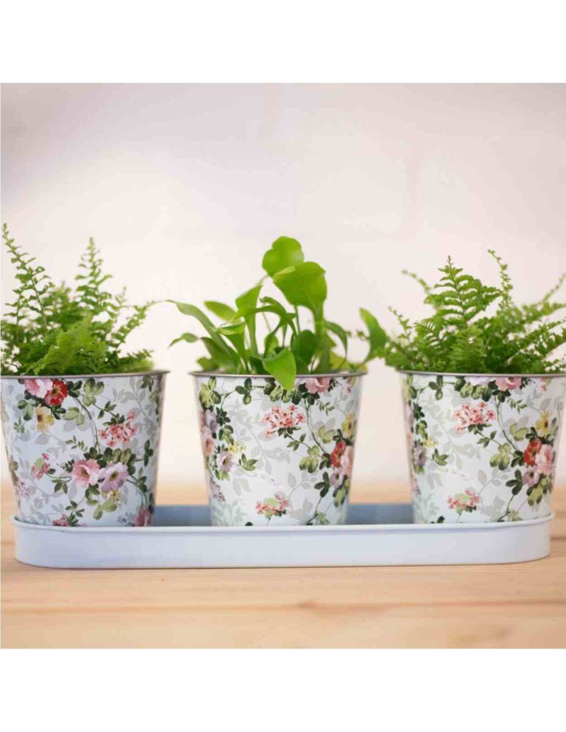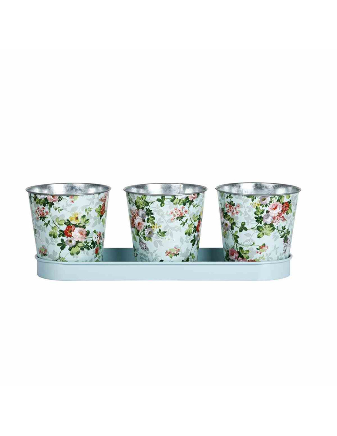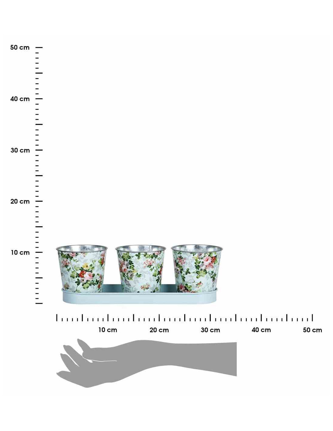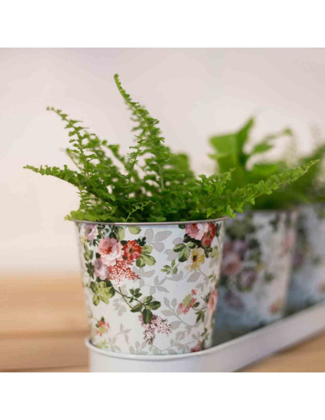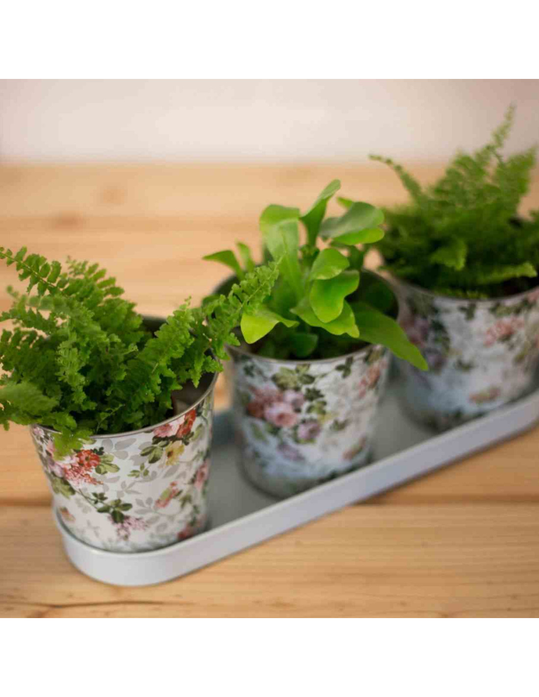 Esschert DesignTrzy urocze doniczki na podłużnej tacy, które stanowią piękny dodatek nie tylko do wnętrza, ale także na balkon lub taras. Wyróżnia je piękny, różany wzór. Zestaw wykonany został ze stali galwanizowanej, przez co jest lekki, a zarazem trwały i wytrzymały. W doniczkach można zasadzić kwiaty a także zioła, które dodadzą uroku na parapecie kuchennym. Unikalny styl donic sprawia, że staną się one nie tylko praktycznym elementem wyposażenia, ale również oryginalną ozdobą każdej przestrzeni.